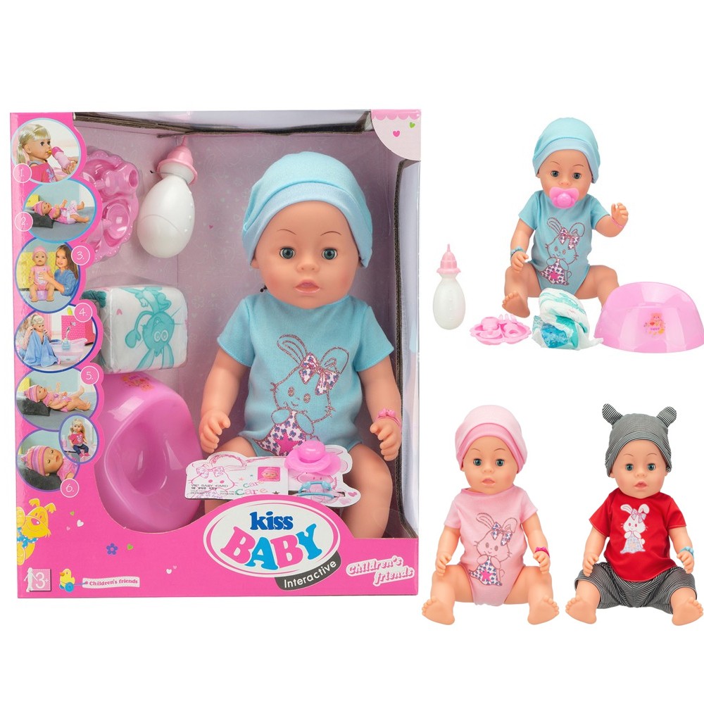 Interaktív baba 40 cm, OEM, 6 tartozék, 3 éves kortól, baba cumisüveggel és bilivel