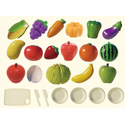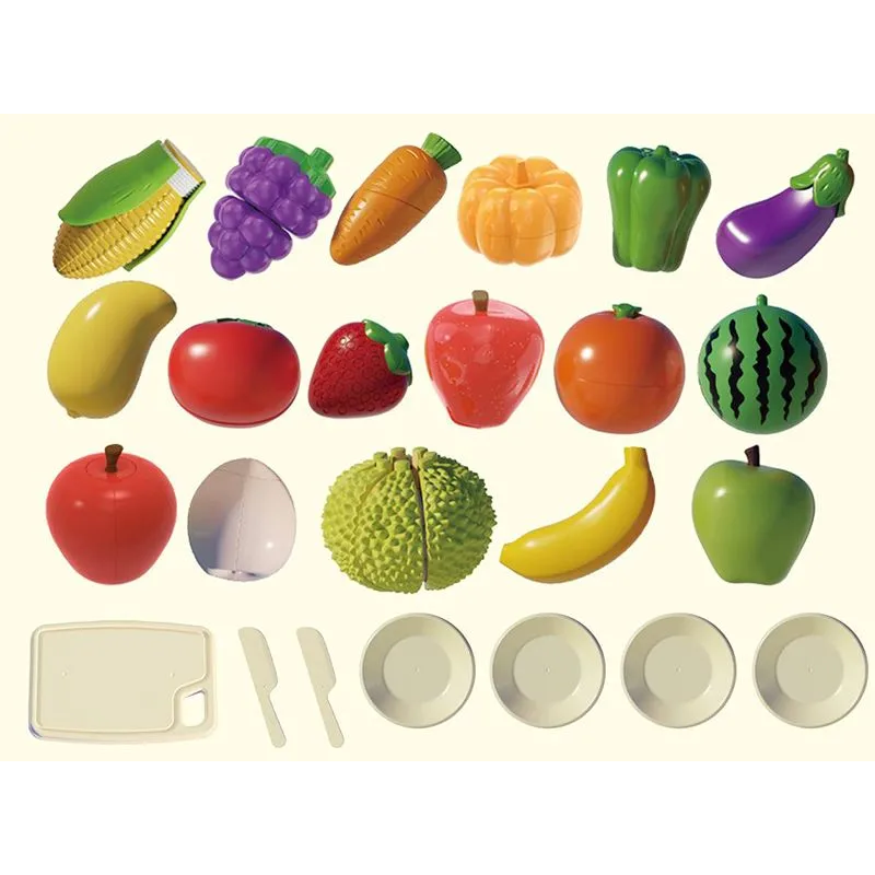 Tartozékok: játék kés, vágódeszka, tányérok, zöldségek és gyümölcsök
