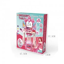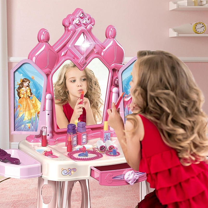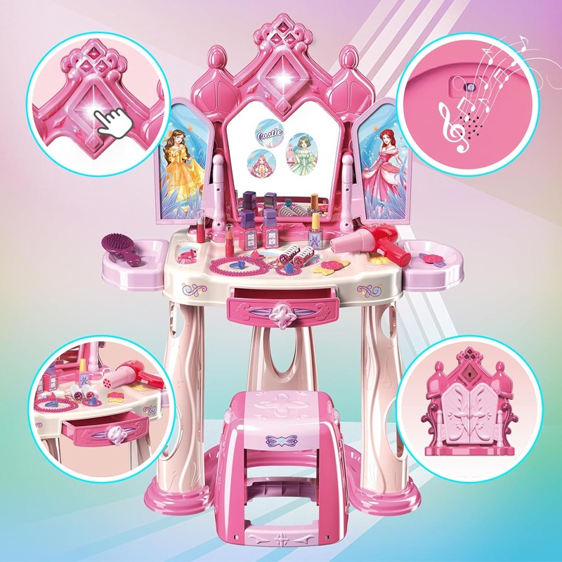 A tükör körül LED-lámpák vannak, amelyek az asztal bekapcsolásakor világítanak, gyengéden megvilágítva és ragyogó hatást keltve, tökéletes sminkeléshez és játékhoz. A fények extra realizmust kölcsönöznek, varázslatos és magával ragadó hangulatot teremtve a gyermekek számára.
