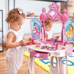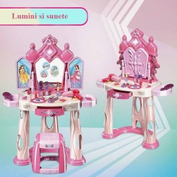 Sminkasztal kislányoknak, szék és tükör, különböző kiegészítők, fények, zene, hercegnős képek, tároló fiók, nyitható ajtó, elem, rózsaszín, 3 éves kortól
