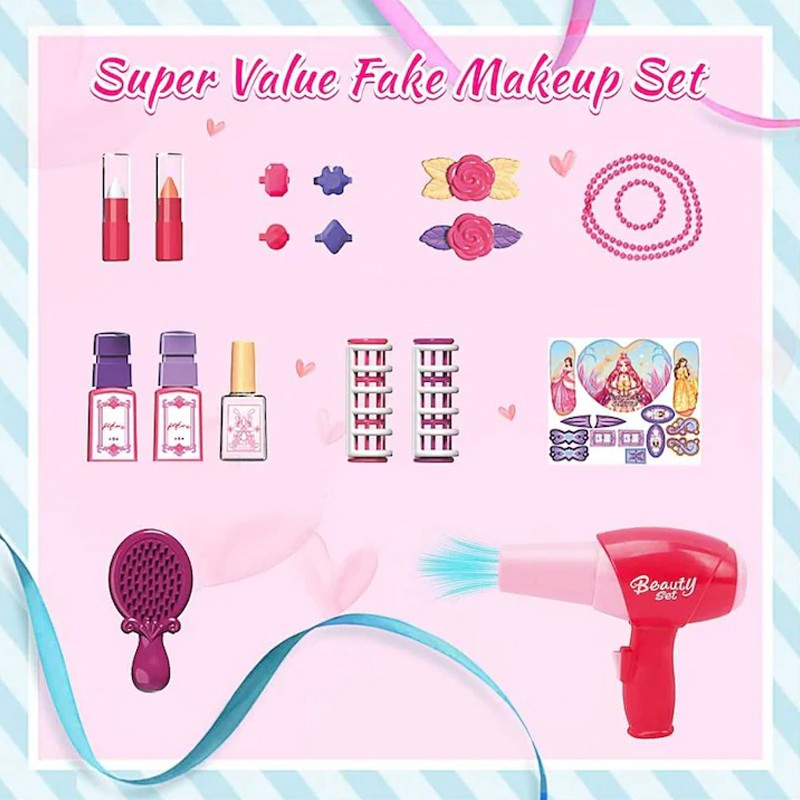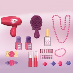 A készlethez számos tartozék tartozik, amelyek mind biztonságosak, például játék rúzsok, karkötők, körömlakkok, matricák, hajcsatok és még sok más. Az ékszerek eleganciát kölcsönöznek, és minden játékülést különleges pillanattá varázsolnak, míg a körömlakkos üvegek kreativitást és hitelességet kölcsönöznek a szépségszalonban való játéknak.