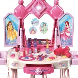 A sminkasztal bájos, pasztell rózsaszín árnyalatokban pompázik, ideális a kislányok számára, akik szeretik a szerepjátékokat felfedezni. Finom részletekkel, hercegnők képeivel és csillogó elemekkel van díszítve, amelyek megmozgatják a képzeletet és mesebeli hangulatot teremtenek.