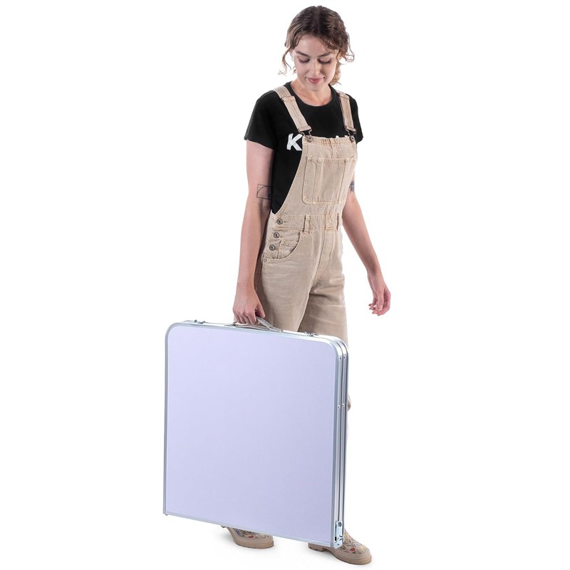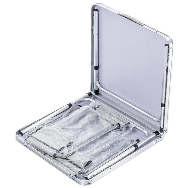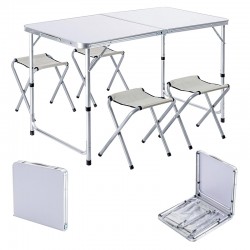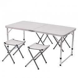 Összecsukhatóságának és kis méretének köszönhetően, az asztalból és 4 székből álló készlet ideális kempingezéshez vagy baráti és családi utazáshoz. Összecsukva az asztal egy aktatáskává alakul, amelyet bárhová magával vihet, anélkül, hogy sok helyet foglalna. A székek szintén összecsukhatók, és az asztal belsejében tárolhatók. Az asztal magassága 55 és 70 cm között állítható, így a gyerekek és a felnőttek számára is kényelmes.