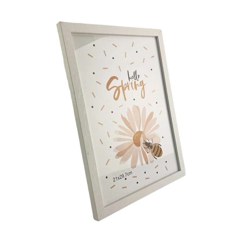 A4-es fa képkeret, 21 x 29,7 cm, spirálozott, fehér, ideális íróasztalra vagy más sík felületre.