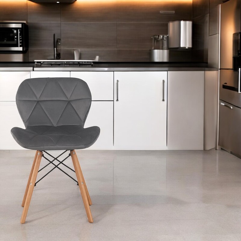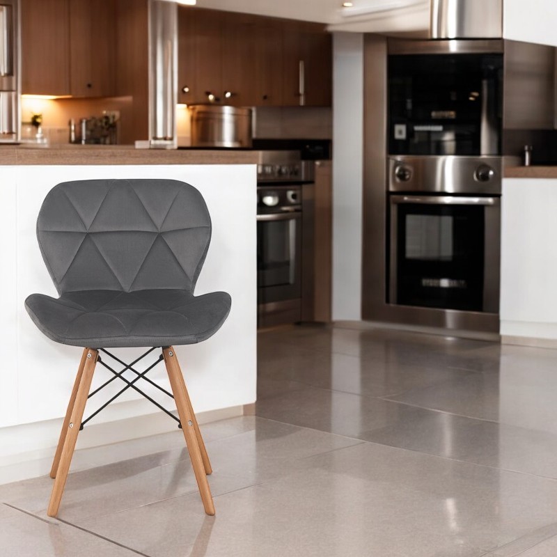 A skandináv stílusú konyhai vagy étkezőszék tökéletes egyensúlyt teremt a funkcionalitás és a minimalista esztétika között. Az elegáns szürke árnyalatú, puha bársony kárpitozás kifinomult, mégis meleg és barátságos megjelenést kölcsönöz a széknek. A bársony kellemes tapintású textúrát nyújt, a minőségi anyag pedig tartósságot és könnyű karbantartást biztosít.