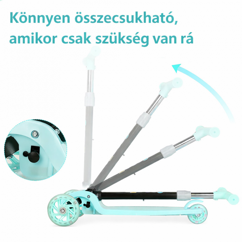 A kormányrúd magassága állítható, így a roller a gyermek növekedésével együtt használható, hosszabb távon is praktikus választás a szülők számára. Az összecsukható kialakítás megkönnyíti a szállítást és a tárolást, legyen szó autós utazásról vagy otthoni elhelyezésről.