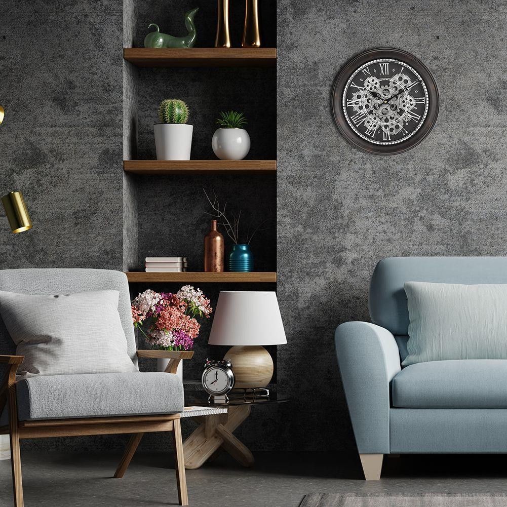 Az órát a valós időben mozgó fogaskerekekkel ellátott loft mechanizmus jellemzi. Az óra alkalmas ipari stílusban díszített belső térbe, tökéletes ajándék ötlet a kortárs tárgyak kedvezőknek. 1,5 V-os AA elemmel működik, amelyet a csomag nem tartalmaz. Az óra átmérője 35 cm, így könnyen falra szerelhető.